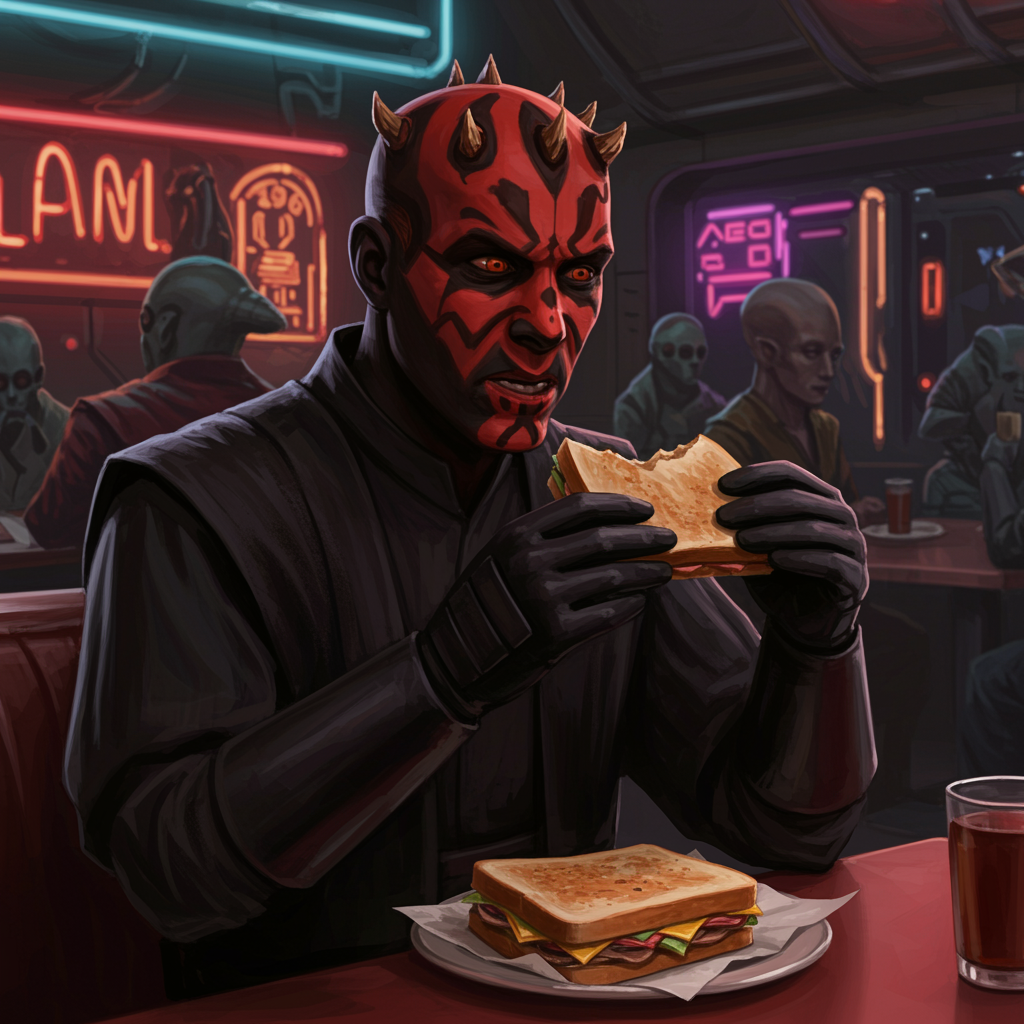 Darth Maul enjoying a hearty sandwich in a futuristic sci-fi diner, surrounded by neon lights and alien patrons, his expression a mix of focused determination and subtle satisfaction as he savors each bite.