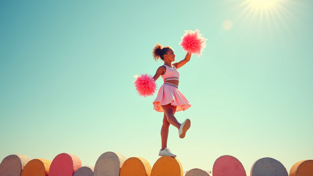 Decked out in a vibrant cheerleader uniform, she balanced confidently on a sequence of undulating stepping stones, each one a unique shade of pastel, creating a playful path under the sunny afternoon sky. Her pom-poms shimmered with each movement, reflecting the joyous energy of her high-spirited routine.