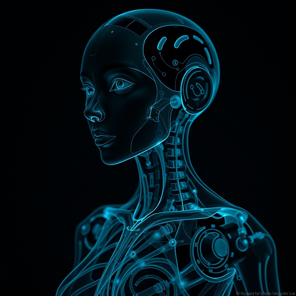 View this AI-generated image featuring a hyper realistic depiction of a humanlike android with a feminine form captured in the style of x ray film bathed in dark cyan and black tones its face exudes youthful energy while the body is akin to graceful sculptures a focus on the intricate joints and con