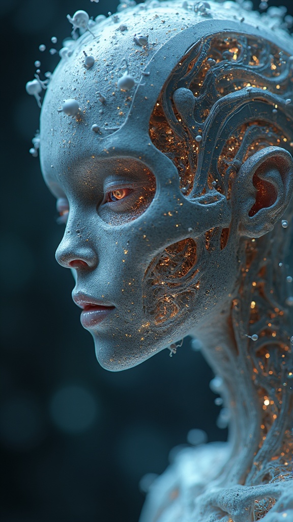 View this AI-generated image featuring a mesmerizing depiction of a surreal neural network entity one side of the face revealing a robotic skeleton with exquisite facial details viewed from a 45 degree angle the artwork is graceful featuring a holographic and electronic feel with utmost detail the i