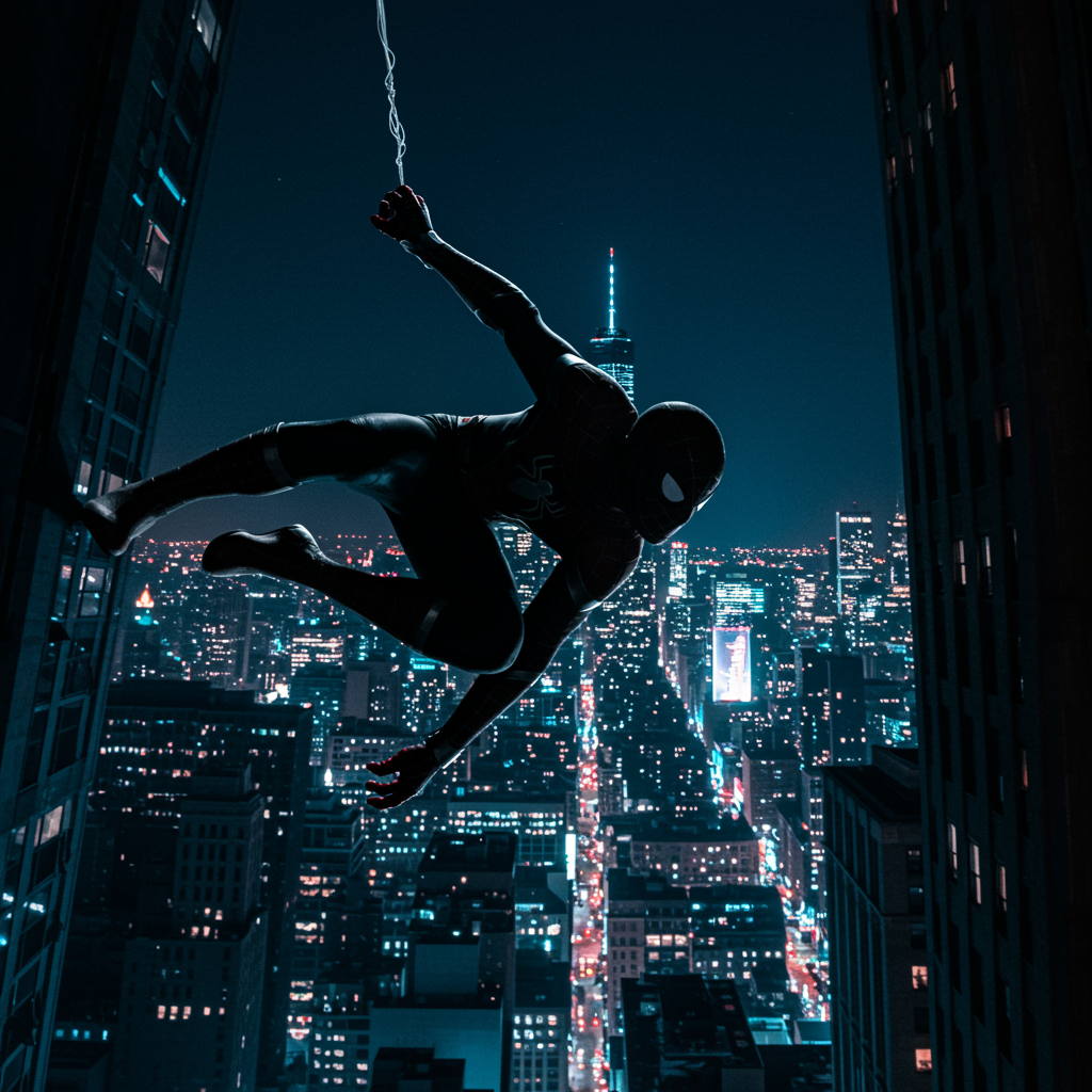 A vivid depiction of Spiderman in his sleek black suit, dramatically silhouetted against the vast nighttime cityscape, effortlessly clinging to a majestic skyscraper with one powerful hand. The bright lights from the sprawling metropolis create a luminous glow over the towering buildings, casting intricate shadows within the alleys below. Shot using a Canon EOS R5 paired with a Canon RF 24-70mm f/2.8L lens, the camera settings include an ISO of 200, an aperture of f/2.8, and a 15-second shutter speed. The camera is secured on a Manfrotto MT055CXPRO4 tripod and controlled via a Canon BR-E1 remote shutter release. The composition explores low-angle shots and innovative framing to highlight Spiderman's silhouette against the shimmering city lights, maintaining the essence while introducing subtle creative elements.