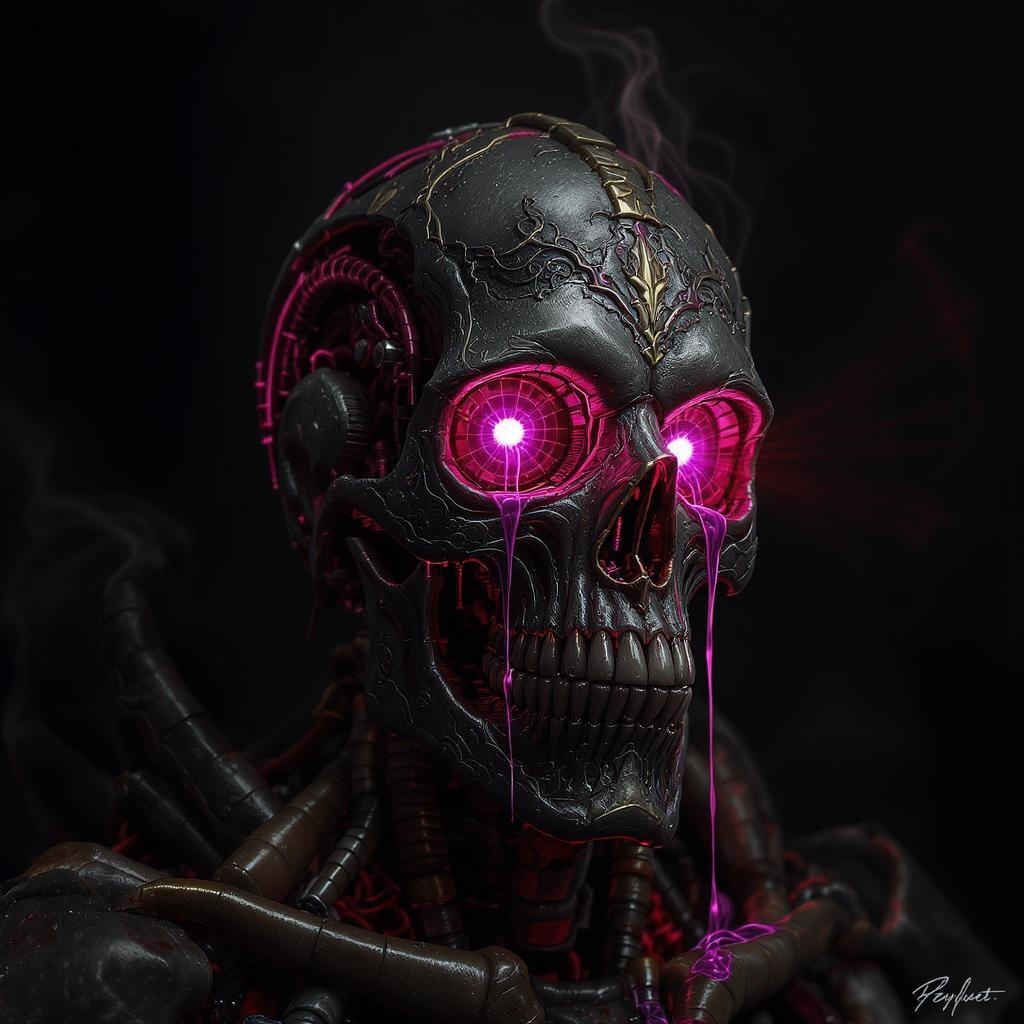 View this AI-generated image featuring a highly detailed composition showcasing a skull with intricate mechanical components accented by a vivid pink luminescent fluid flowing from its eyes the scene is captured with sharp focus and extreme detail set against a somber backdrop with dim illumination