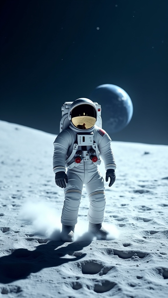 A highly detailed and realistic image of an astronaut standing on the moon's surface, their visor reflecting the distant Earth. The cold color palette features icy blues and muted grays, casting a serene and otherworldly atmosphere. The lunar landscape is intricately textured, with craters and shadows sharply defined under the soft glow of an overhead sun. A faint mist of lunar dust swirls around the astronaut's boots, adding a sense of motion to the stillness. The background stars twinkle faintly against the dark expanse of space.