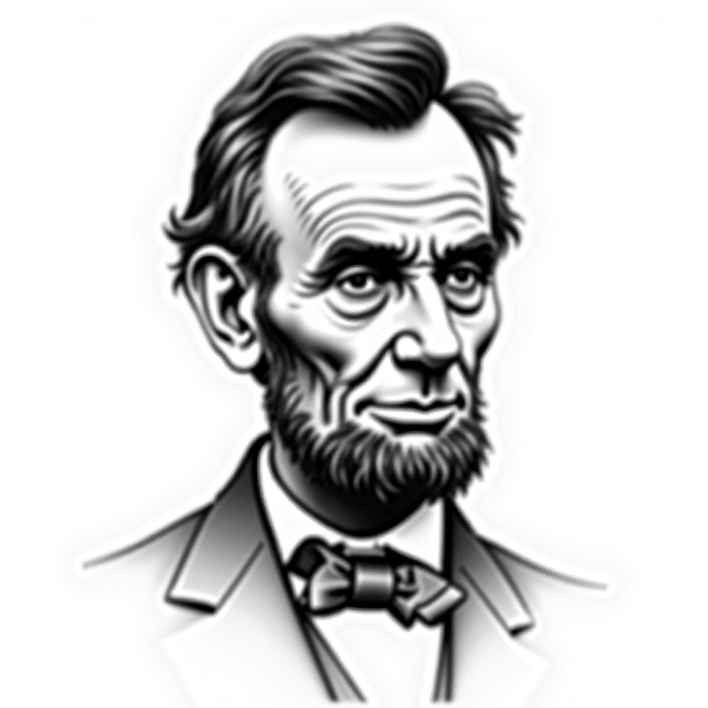 Detailed ink portrait of Abraham Lincoln, showcasing hyper-realistic features, set against a pristine white background, slight artistic embellishments for a modern touch.