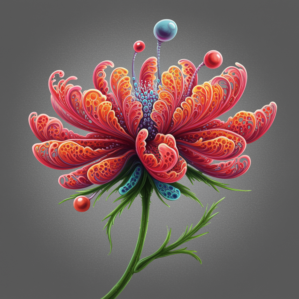 View this AI-generated image featuring a highly detailed painting of a vibrant flower on a muted gray background inspired by the intricate airbrush techniques of ernst haeckel boasting elements of cloisonnism with bold outlines and vivid colors exhibits biomorphic forms and textures trending in digi