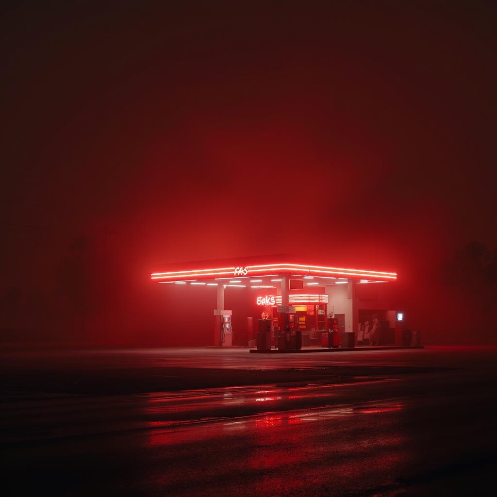 A meticulously detailed photograph capturing a solitary, neon-lit gas station enveloped in a dense fog, tinged with an eerie red hue, evoking the 1980s nostalgia. The scene is shrouded in an overcast night, where time seems to have paused. This potential award-winning image exudes a moody, timeless atmosphere, with long exposure capturing the subtle reflections on the wet pavement. The vibrant glow of the neon lights contrasts starkly with the shadowy, volumetric fog, reminiscent of Edward Hopper's poignant Americana. The setting, crafted with realistic CGI, boasts cinematic realism and mid-century charm, set amidst an isolated expanse with silhouettes of distant trees adding to the desolate beauty. Rendered with an octane engine in 4k resolution, this masterpiece, while core in its inspiration, subtly integrates modern surrealism to be a trending piece on ArtStation.