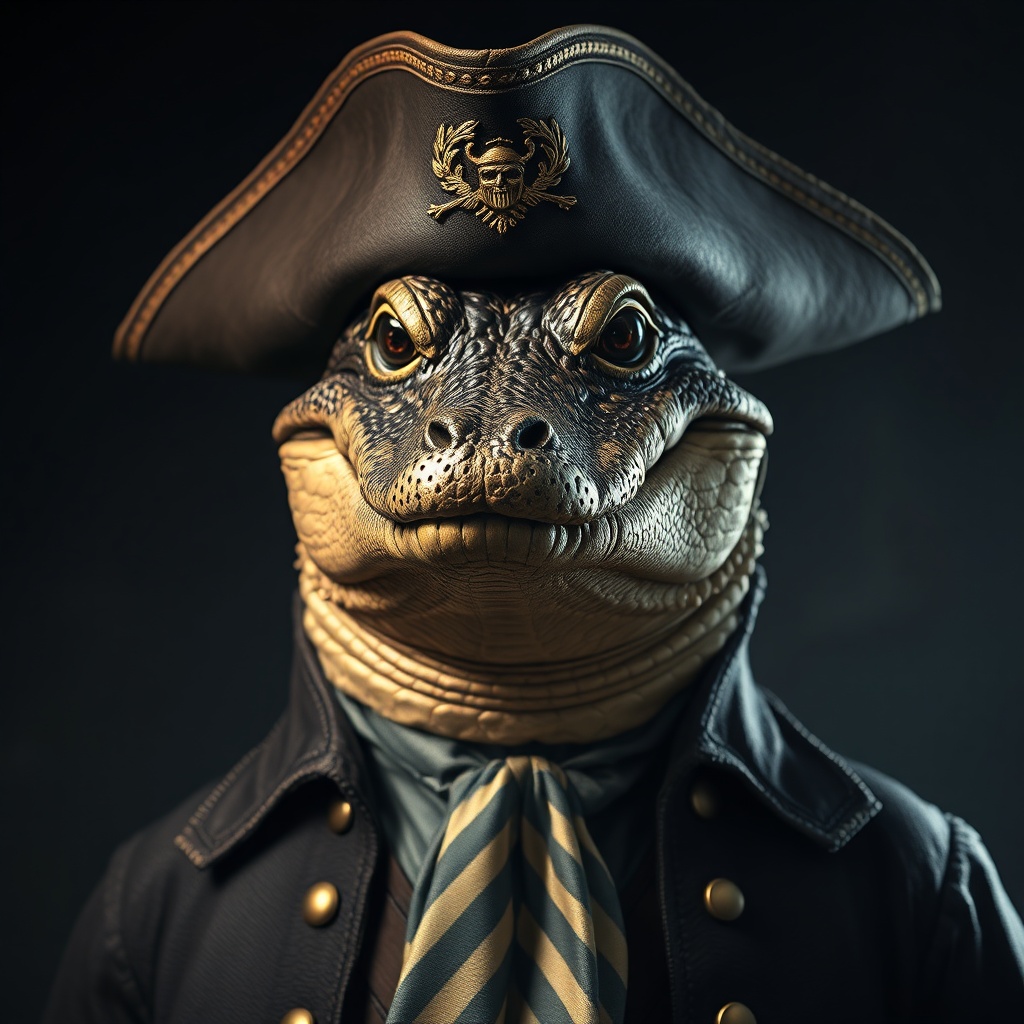 A highly detailed and realistic portrait of an anthropomorphic alligator dressed in opulent 18th century pirate attire, featuring a worn tricorne hat adorned with a tarnished gold emblem and intricate embroidery. The creature sports a weathered neck tie, the fabric patterned with faint stripes reminiscent of ocean waves. Its scales glisten under the highly cinematic and dramatic lighting, casting deep shadows that emphasize the alligator's formidable features. With dark, muted colors dominating the palette, the character's piercing eyes shine with intelligence and cunning. Capturing the essence of a video game protagonist and the captivating quality of an HBO production, the portrait conveys a sense of adventure and mystery, rendered in stunning HD and 4K clarity.