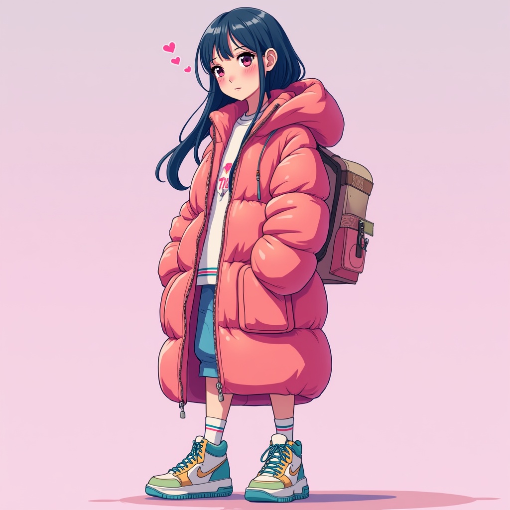 A vibrant digital artwork featuring a woman in a poncho-like oversized puffer jacket, blending Off-White inspiration with a Tumblr aesthetic and Yanjun Cheng style. The design echoes the iconic lofi girl meme, capturing a retro anime vibe with bright pastel colors, reminiscent of works by Beeple, Rhads, and Lois van Baarle. This captivating illustration features a cartoon style, trending on Dezeen, showcasing a character that seamlessly merges modern streetwear with nostalgic anime influences, set against a playful, easygoing backdrop.