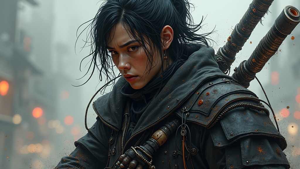 View this AI-generated image featuring digital wallpaper portrait of a fierce cyberpunk samurai anime inspired in the style of a dark and moody marvel comic the composition is epic and dramatic with intricate details muted colors enhance the atmosphere and the scene is chaotic and intense the figure