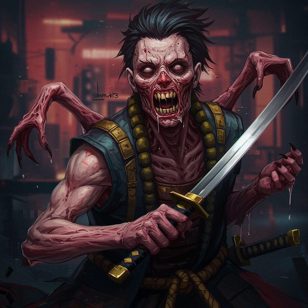 Digital wallpaper portrait of a brutal cyberpunk samurai, anime-style, inspired by Marvel comics, using dark, muted colors. Features a dynamic and dramatic composition in digital painting with intricate details. The scene highlights elements of distortion: jpeg artifacts, poor quality, and duplication. The character displays exaggerated features such as poorly drawn hands and face, mutations, and deformed anatomy. They have unnatural proportions, like extra and missing limbs, a long neck, and a cloned, disfigured face. The background includes intentional visual clutter: camera artifacts, name, signature, watermark, and logo marks. The figure embodies a morbid aesthetic with a dehydrated appearance, bad teeth, and grossly malformed body parts.
