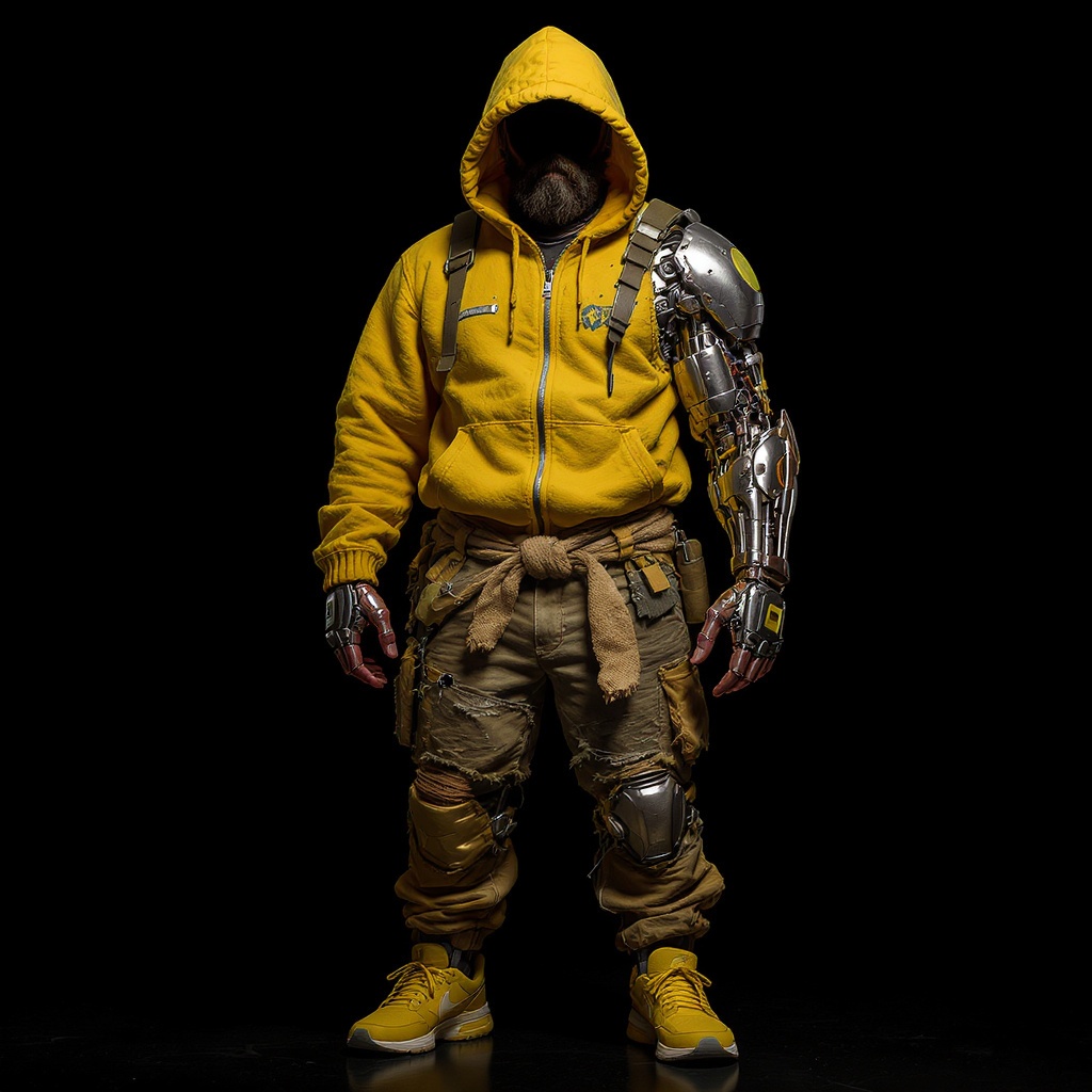 In a dramatic display against a stark black background, the character commands attention through a fusion of advanced technology and traditional rugged attire. They wear a vivid yellow hoodie, its rugged texture and practical features like zippers and straps exuding durability and functionality. Complementing this, their pants are crafted from a coarse, weathered fabric, intentionally torn to reflect a life spent in a tough, possibly post-apocalyptic world. Earthy tones of the pants enhance the rugged aesthetic, while a rough, hand-tied fabric belt underscores the character's resourcefulness, adding a traditional and handcrafted touch. The left arm is a marvel of futuristic tech, complete with intricate wires, metallic joints, and sleek panels, hinting at prosthetic enhancement or augmentation for superior capability. A metallic brace shields the knee, seamlessly integrating with similar technological motifs as the arm, while the high-tech footwear—a stylish yellow athletic sneaker—provides a sleek contrast to the ensemble, embodying modernity amidst the rugged apparel.