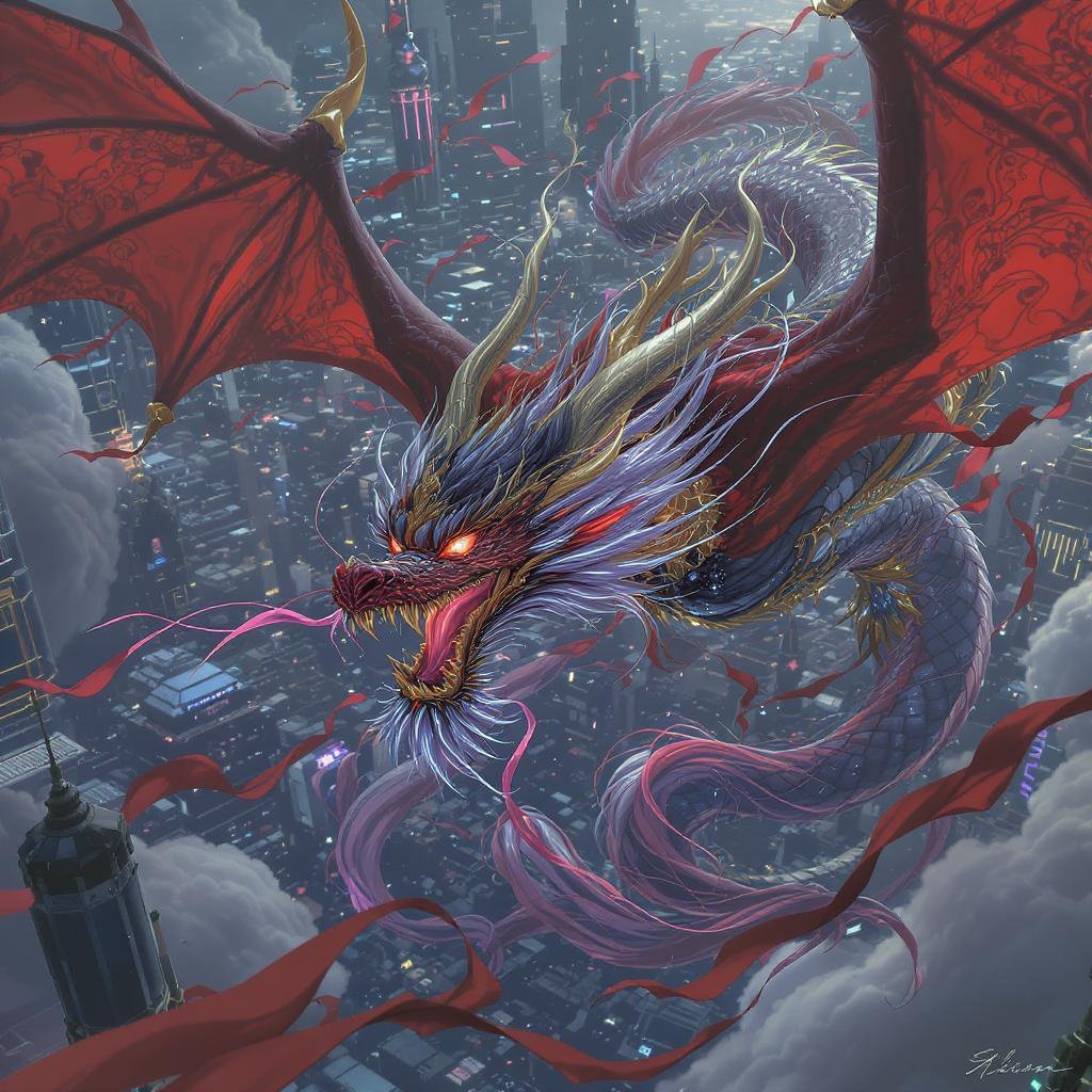 A majestic dragon soars through a modern cyberpunk fantasy world, blending the grace of Kyoto Animation's anime style with the intricate elegance of traditional Chinese art. The scene is bathed in cinematic lighting, featuring ethereal illumination and incredible, intricate details. The vibrant, rich colors create a hypermaximalist masterpiece that showcases the dragon's shimmering scales and flowing mane. Aerial views reveal a stunning, complex cityscape below. The dragon gazes directly, its eyes reflecting wisdom and mystery, while its form captures smooth, elegant lines. Dark fantasy elements and glittering jewelry accentuate the setting, while beautiful, fair-skinned figures with glamorous faces are incorporated into the scene, adding depth and narrative. Lighting and shadow interplay in gorgeous harmony, offering an 8k visual feast. The composition is rich in detail, with everything in perfect harmony, creating a breathtaking, ultra-high-definition image.