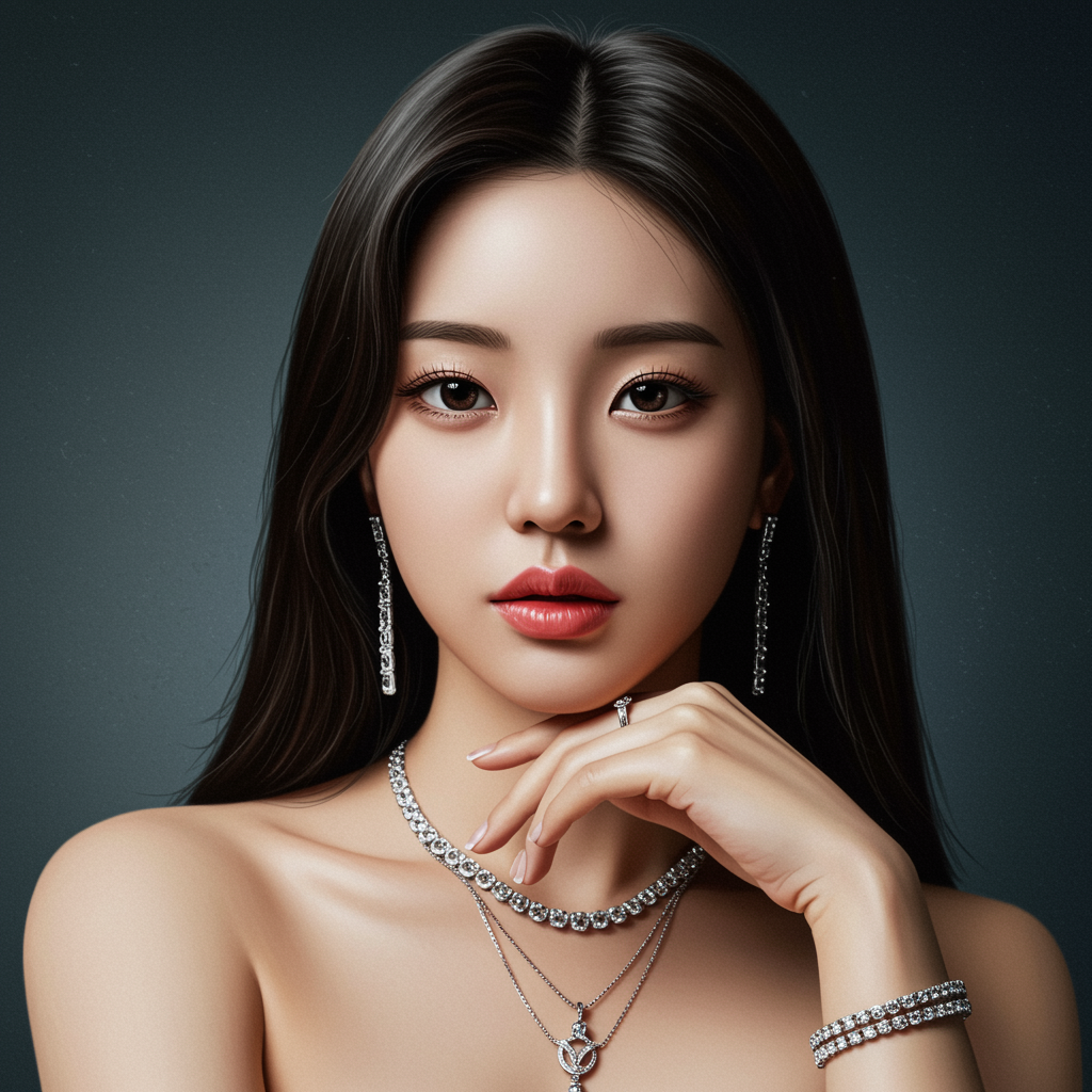 Elegant Korean woman, kpop star, perfect features, lifelike, vivid focus, HD, detailed, intricate, portrait photography, hyper-realistic, cinematic studio shot, dramatic lighting, wearing jewelry, 3D-inspired, anime influence, illustration style, digital art rendering, precise digital painting, avoid distortion, clarity over errors, clean composition, natural anatomy, balanced proportions, accurately depicted, fluid lines, high quality visuals, artistic integrity, expressive yet realistic portrayal, harmonious design.