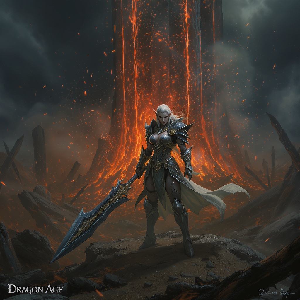 A stunning Elf warrior, radiating powerful rage and divine poise, stands at the heart of a forgotten battlefield. Her intricate armor gleams with ethereal light, each piece a testament to years of craftsmanship and battle-worn resilience. She wields an exquisitely detailed weapon that seems forged from the essence of the earth itself. Behind her, a towering wall of fire casts flickering shadows, adding a dramatic backdrop to the scene. The battlefield, littered with remnants of an epic struggle, stretches out under an expansive aerial perspective, conveying the massive scale of the confrontation. The atmosphere is charged with a dark fantasy aura, where crepuscular rays slice through the smoke-filled sky, illuminating patches of devastation. This CGI masterpiece captures her in a slow-motion pose that emphasizes her beauty and strength, as sunbeams create a photorealistic play of light and shadow across her features. The scene is rendered in hyperrealistic detail, with a Dragon Age style that immerses the viewer in its complicated, maximalist design, ensuring the depth and complexity of this epic narrative are profoundly felt.