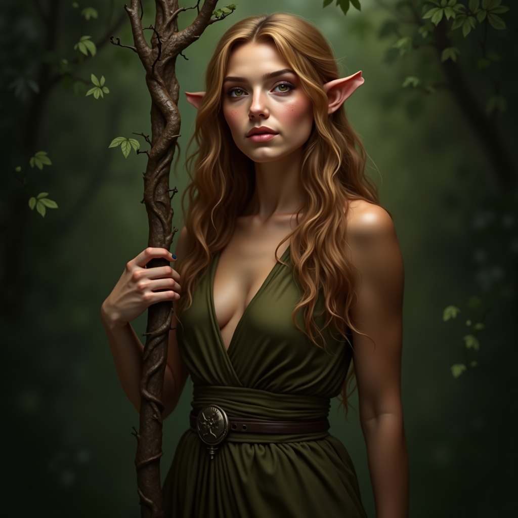 View this AI-generated image featuring elira is a gentle and wise elven druid with an innate connection to the natural world and its creatures her flowing golden brown hair and serene hazel eyes echo her deep bond with the earth and its life giving energy holding a gnarled staff entwined with vines