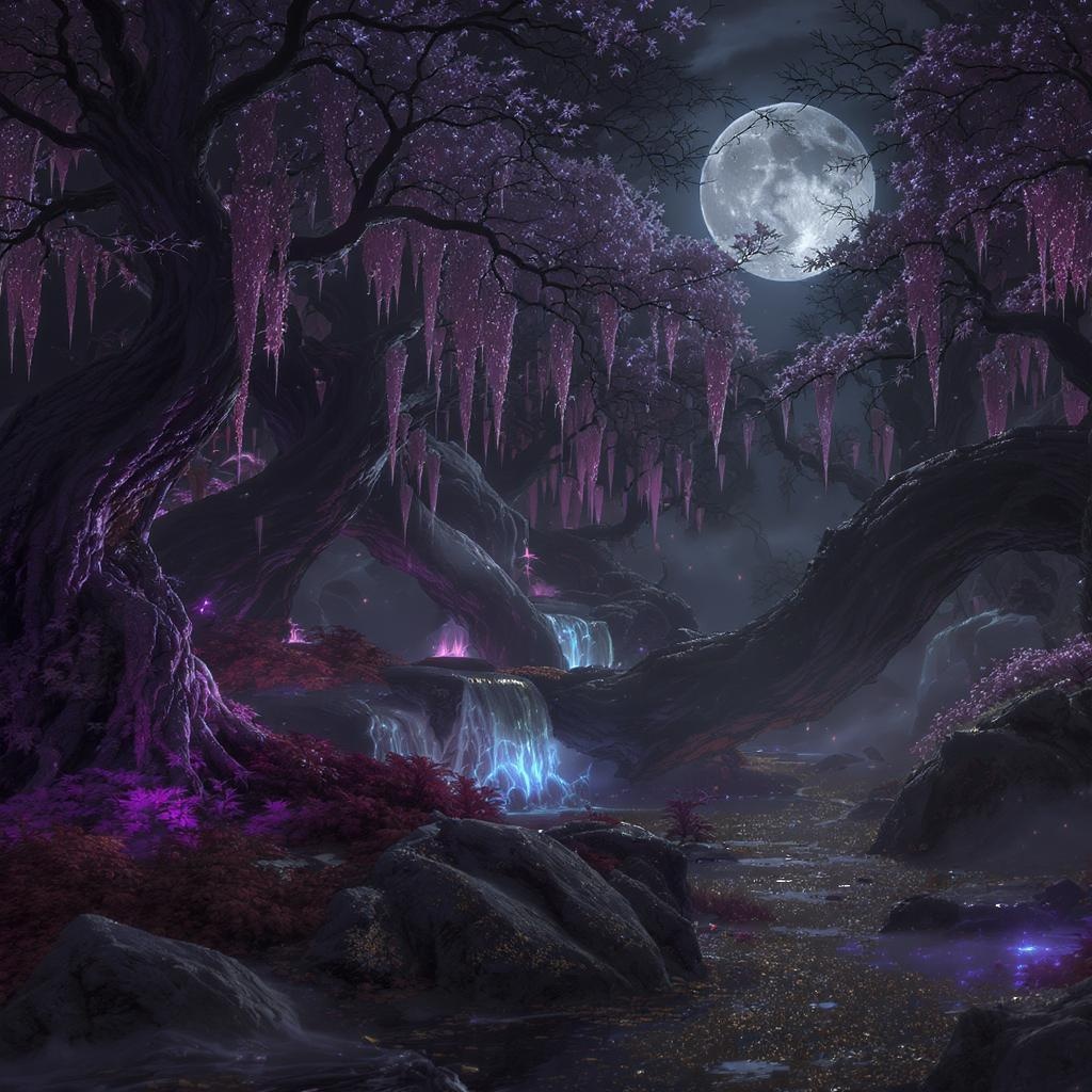 View this AI-generated image featuring enchanting night scene intricately designed dark fantasy realm dazzling full hd resolution breathtaking 8k detail highly polished concept art style rendered in unreal engine capturing the imagination with its atmospheric allure showcased with subtle volumetric