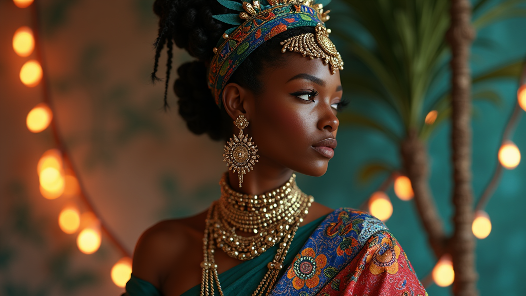 Exquisite art deco afrocaribbean model showcasing an elaborate art deco peacock gown sari, rich in vibrant colors and intricate design, enhanced by stylized face art. Captured in a high-definition studio portrait, rendered in 8k using octane software, blending visual elements reminiscent of Sylvain Chomet's animation style, Team Fortress 2's bold character design, and the enchanting aesthetic of Breath of the Wild. The scene is infused with a masterful use of color theory, providing depth and contrast throughout the composition.
