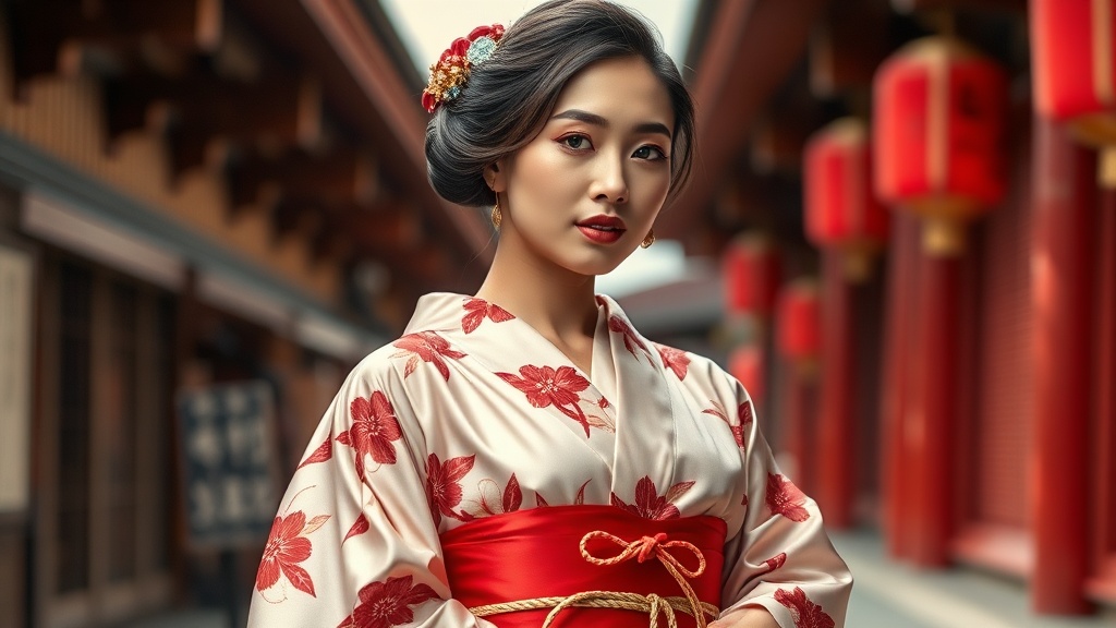 Exquisite 4K masterpiece featuring a stunning woman wearing a luxurious silk kimono adorned with an intricate red and white floral design. The shiny fabric glistens under the soft lighting, highlighting the vibrant red obi belt, elegantly tied with a delicate golden rope. Her hair, styled in the traditional geisha manner, complements the refined elegance of her ensemble. The scene unfolds in the heart of Kyoto, where the detailed background adds richness to the composition. The woman stands confidently, her alluring figure enhanced by the graceful drapery of the kimono, captivating the viewer with her poised yet playful expression as she poses for the picture.
