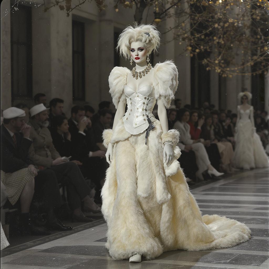 Fall 2017 Paris fashion week in the style of Irving Penn, with a palette of ivory, exploring the juxtaposition of classic elegance and avant-garde with a touch of poodlepunk. Draw inspiration from the eras 1860–1969, incorporating textures of leather and hide. Channel the whimsical and intricate detailing reminiscent of Richard Doyle, embracing elements of ready-made art. The scene is set in a dynamic 2:3 aspect ratio, with a focus on raw, unfiltered style and an intriguing blend of tradition and innovation.