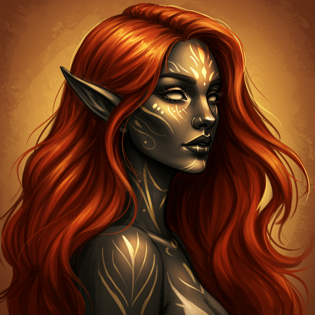 View this AI-generated image featuring a stunning fantasy woman with flowing red hair depicted in a realistic style embodying the essence of fawncore the artwork is rendered using black and amber tones featuring varied brushwork techniques that bring depth and texture her features include a distinct