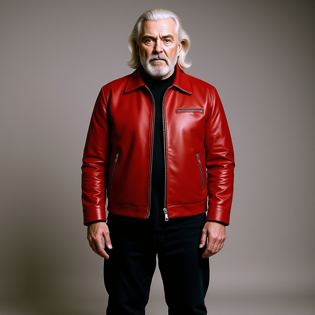 A cinematic fashion-inspired portrait of Gandalf adorned in a metallic red oversized jacket, embodying the avant-garde style of Yeezy and Balenciaga. The image is impeccably sharp, showcasing intricate details with a glamorous and symmetrical composition. Soft, indirect lighting creates a Vogue editorial vibe, capturing Gandalf’s wise and aged features with elegance. His expression is poised and engaging, exuding a sense of timelessness and sophistication. Artfully represented in full body, the scene reflects flawless proportions and natural anatomy, positioned against a simple, elegant backdrop to enhance the luxurious feel.