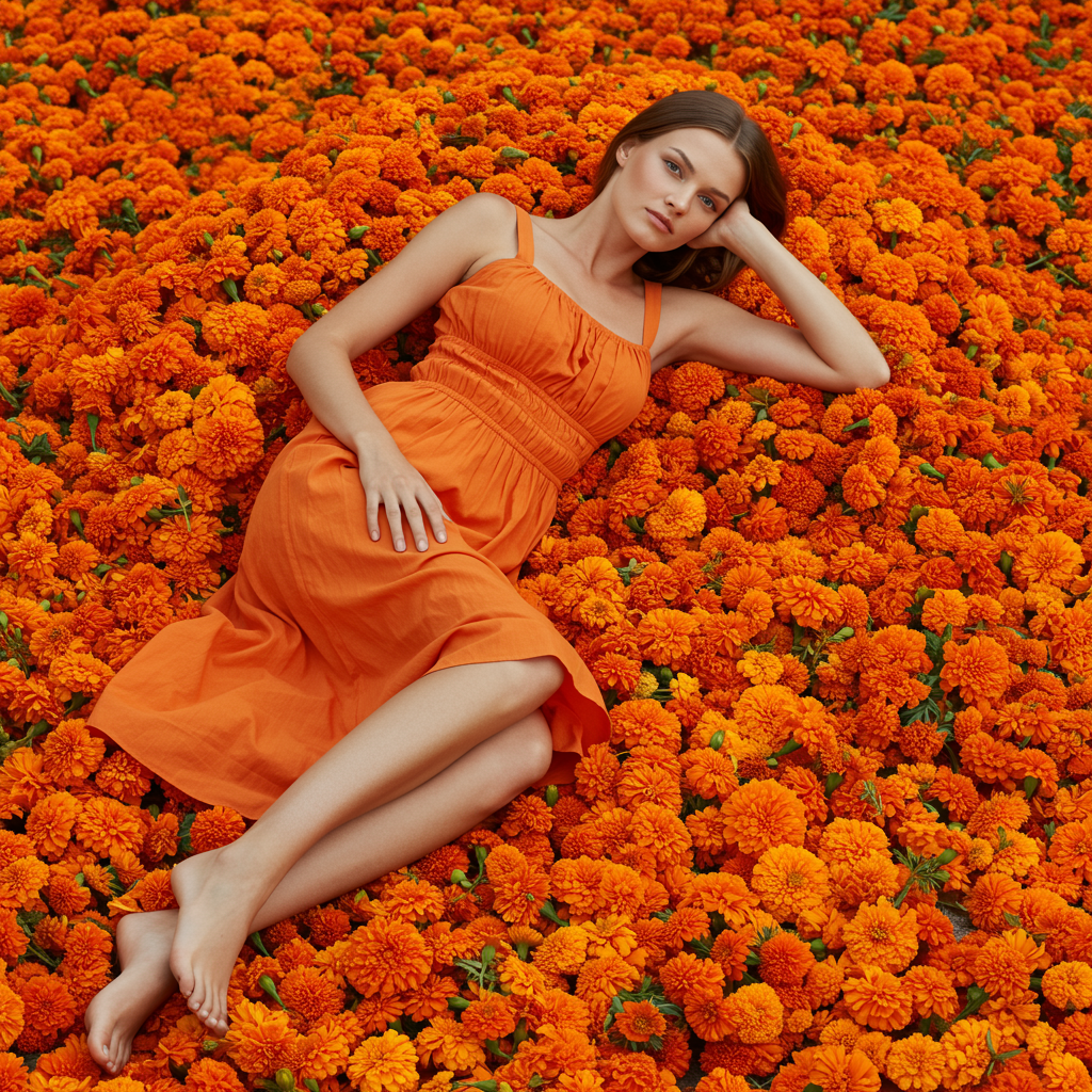 A stunning fashion model elegantly poised in a vibrant tangerine dress, nestled comfortably on a bed of lush marigold blooms, capturing the essence of grace and harmony amidst the vivid display of orange hues.