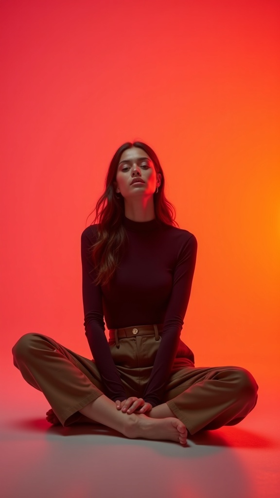 A cinematic fashion photograph for Uniqlo features a woman seated gracefully on the floor, wearing a Uniqlo Heattech top paired with stylish brown chinos. Captured from a wide and low angle, the composition exudes a dynamic and modern feel. The setting is a sleek studio with a vibrant gradient backdrop that seamlessly transitions from rich red to warm pink and bright orange, creating a striking contrast and infusing the scene with energy and warmth.