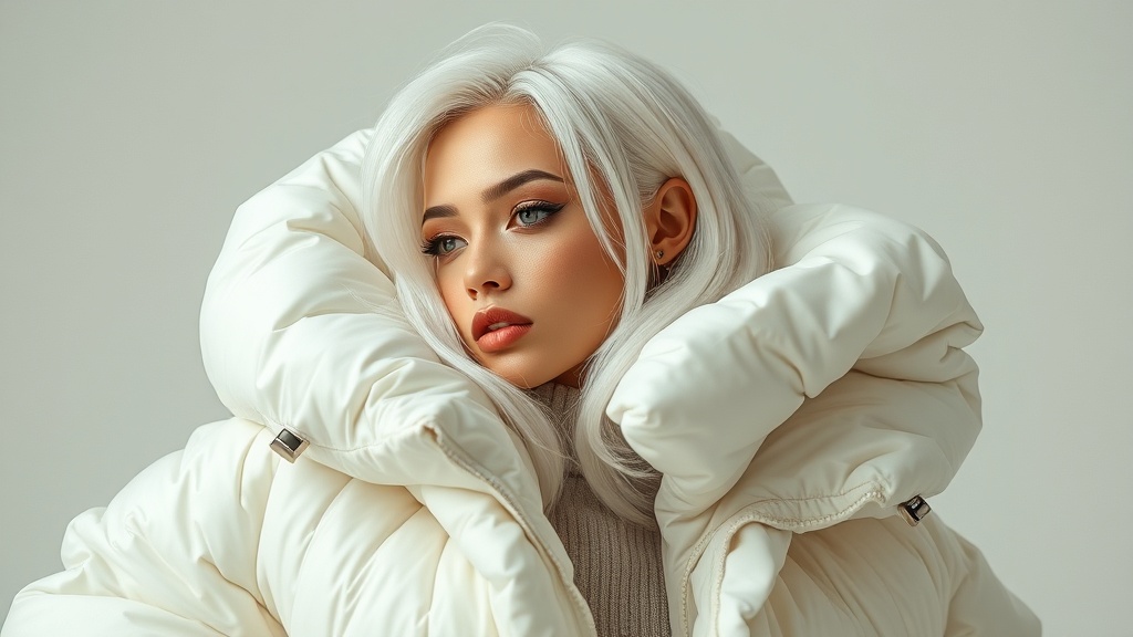 Fashion portrait of an exquisite female with striking white hair, captured in a dynamic pose. She dons an enormously oversized white puffer jacket designed by renowned brands such as Craig Green, Dingyun Zhang, Yeezy, Balenciaga, and Vetements. The image boasts sharp focus and clarity, delivering a cinematic feel with intricate detail. The scene exudes a glamorous and symmetrical aesthetic, reminiscent of a high-end Vogue editorial shoot. The glossy finish enhances the off-white tones, embodying the sophistication of a fashion magazine's editorial spread.
