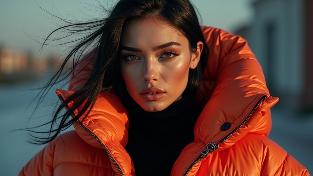 A well-illuminated fashion portrait featuring an extraordinarily beautiful woman adorned in an oversized puffer jacket designed by luxury brands such as Craig Green, Dingyun Zhang, Yeezy, Balenciaga, and Vetements. The image boasts sharp focus and clarity, highlighting detailed textures with a cinematic and glossy finish. The composition is symmetrical, exuding glamorous allure akin to a Vogue editorial fashion magazine shoot, with touches of Off-White design elements for added sophistication and modern elegance.