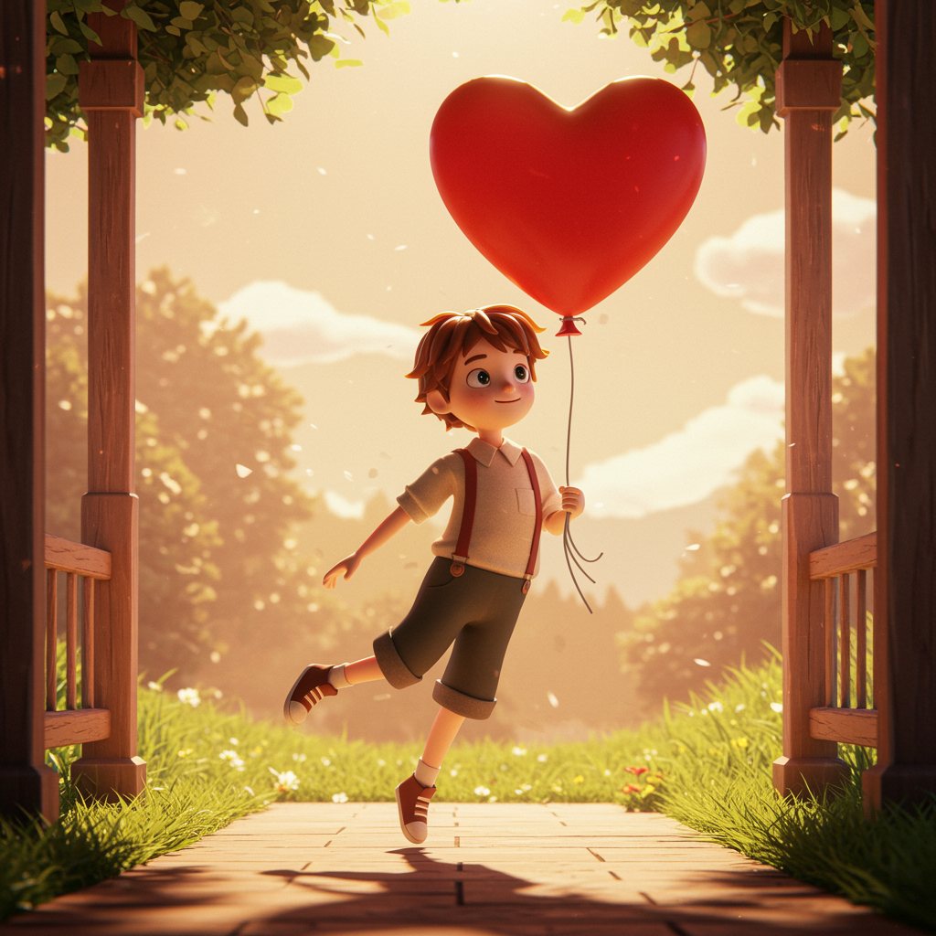 A poster features a young boy holding a heart-shaped balloon, rendered in the style of Sketchfab with influences of Poodlepunk, showcasing warm and inviting tones. The scene includes elements of #screenshotsaturday with romanticized figures and expressive comic panels, intertwined with a touch of romantic academia. The boy is in a dynamic pose, captured in sharp focus with a 32k resolution and HDR details. The illustration evokes a sense of whimsical storytelling, with playful shadows and highlights that add depth and motion to the composition, while maintaining the enchanting essence of the original concept.