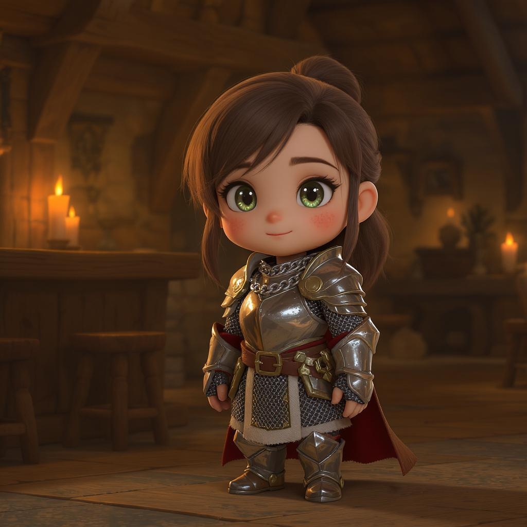 A chibi-style female cleric in gleaming chain mail stands solitary in a medieval tavern, resembling the enchanting artistry of Disney, Pixar, Hayao Miyazaki, and Mark Ryden. Rendered using Unreal Engine 5 and Octane Render for a hyper-realistic touch, the scene is set with cozy indoor lighting, capturing a warm, fantasy ambiance. Her design is detailed and cinematic, a blend of artstation-quality finesse. She has freckles dotting her cheeks, adding charm to her persona. The tavern is lit with gentle candlelight, casting shadows that play across her armor and surroundings. While her features are animated and expressive, the overall atmosphere is detailed, providing a comforting blend of fantasy and realism. The scene focuses on creating a vivid, character-driven moment within this magical, medieval setting.
