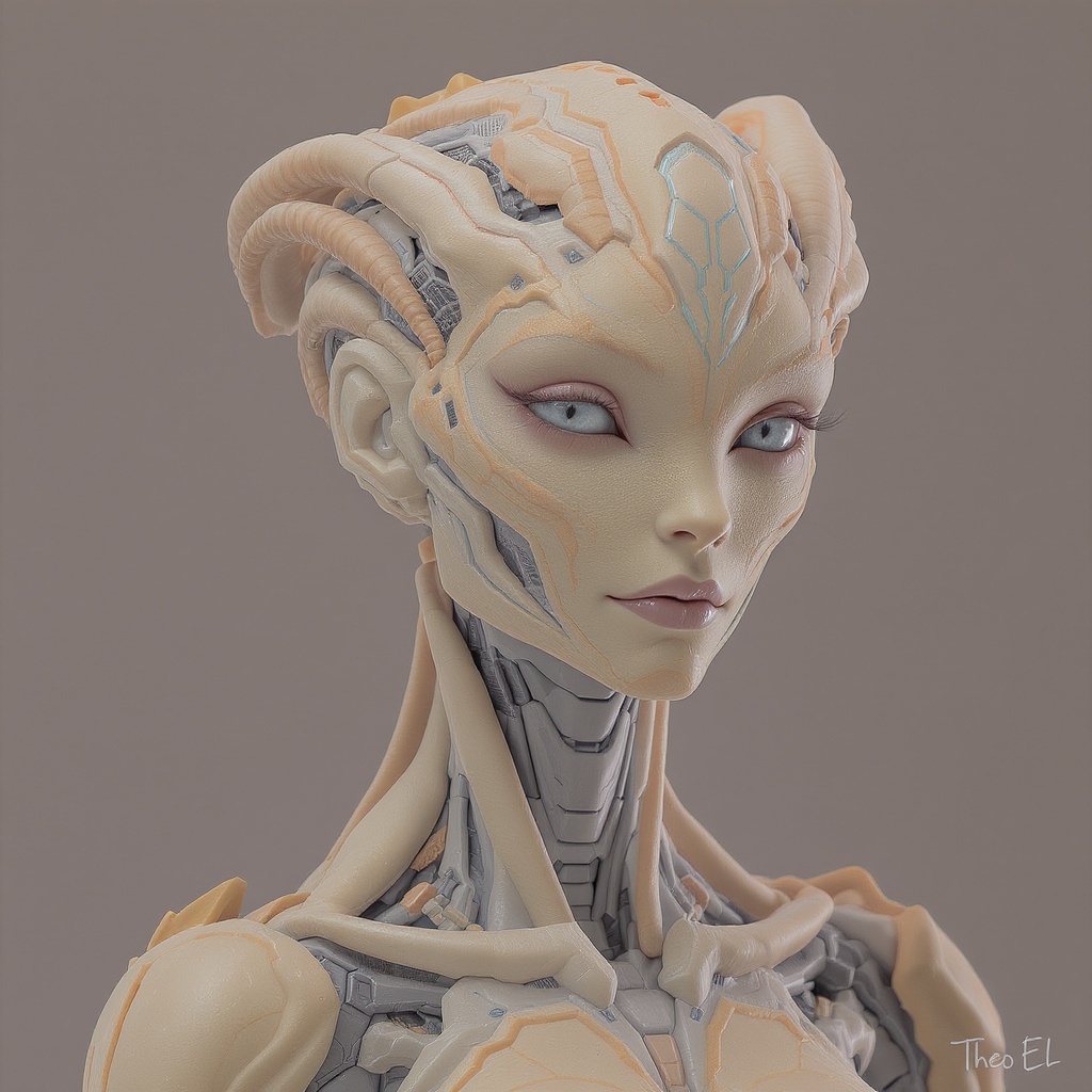 Female extraterrestrial cyborg artwork inspired by Theo El, showcasing harmonious symmetry with light orange and cyan accents. The piece features finely detailed facial features, drawing inspiration from a manticore, and incorporates organic shapes. The composition uses muted tones and is characterized by meticulous portraiture and intricate patterns, with subtle creative variations enhancing the core concept.