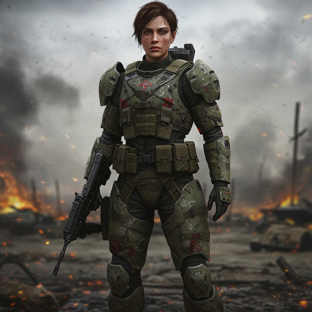 A brave female marine stands amidst a war-torn apocalypse, her futuristic combat armor in ruins. She gazes directly at the viewer, conveying resilience and strength. The background reveals a chaotic battlefield, adding intensity and urgency. Her skin is rendered with intricate detail, achieving a photo-realistic quality. Shot in 8k, this image captures the nuances of her features and armor. Soft, diffused lighting and a shallow depth of field accentuate the realism, while sharp focus ensures clarity. The cinematic CGI lighting imbues the scene with dramatic flair. This hyperrealistic, full-length frame embodies intricate detail and vivid, raw colors for an immersive visual experience.