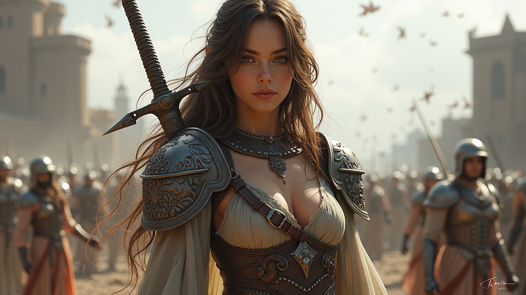 A stunning female warrior standing amidst the aftermath of a battle, her beauty unmatched. Her face is exquisitely detailed, capturing the essence of a fantasy realm. This illustration embodies epic fantasy, with intricate and hyper-detailed elements showcasing concept art. The scene is smooth and sharp-focused, despite the low resolution. Subtle imperfections, like text errors or missing digits, add a touch of mystery. Despite potential flaws like jpeg artifacts or a signature, her form remains powerful, avoiding common missteps like extra limbs or deformations. The artwork retains a captivating allure, with a hint of imperfection enhancing its fantasy charm.