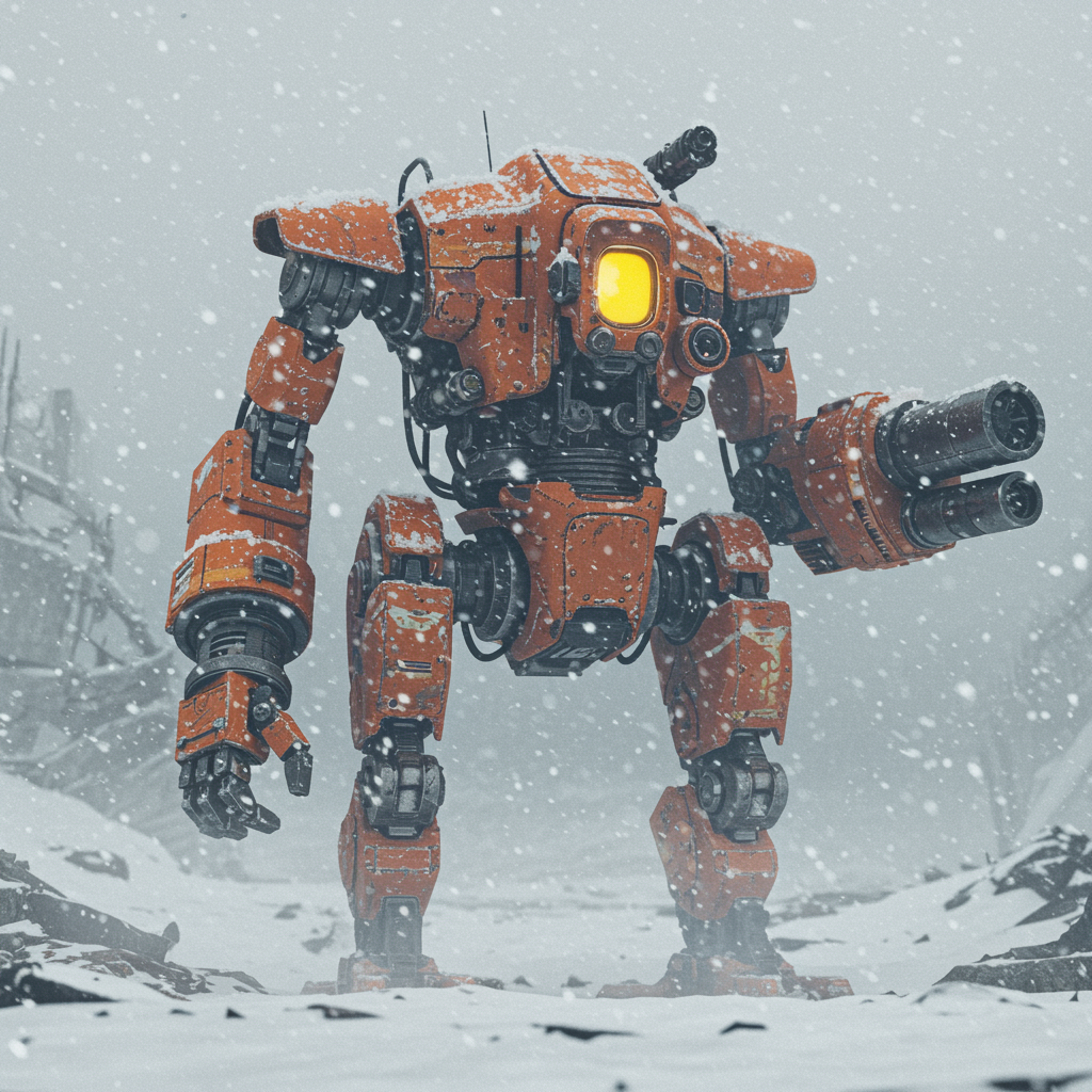 In a snow-blanketed, fog-shrouded post-apocalyptic world, an orange robot stands resilient among the ruins. The close-up angles reveal intricate gears and weathered textures, while low-angle shots highlight its towering silhouette against the bleak, desolate landscape. Snowflakes cling to its metallic surface, mingling with the ethereal mist, as it surveys the horizon, a solitary beacon of color amidst the monochrome desolation.