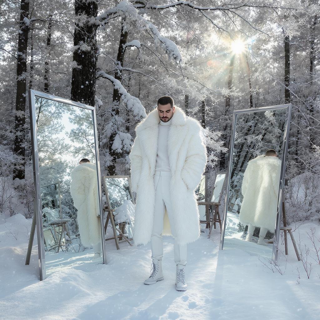 In a tranquil forest shrouded in snow, a 30-year-old man of average height stands amid towering trees draped in a frosty blanket. The earth sparkles with fresh flakes, and the air is crisp and serene. Surrounding him are large mirrors, capturing his reflection from myriad perspectives, crafting a dreamlike, mystical ambiance. He is dressed in an opulent white fur coat and matching trousers, seamlessly merging with the snowy landscape. Gentle sunlight streams through the branches, casting a soft, warm glow that accentuates the enchanting beauty of the winter scene.