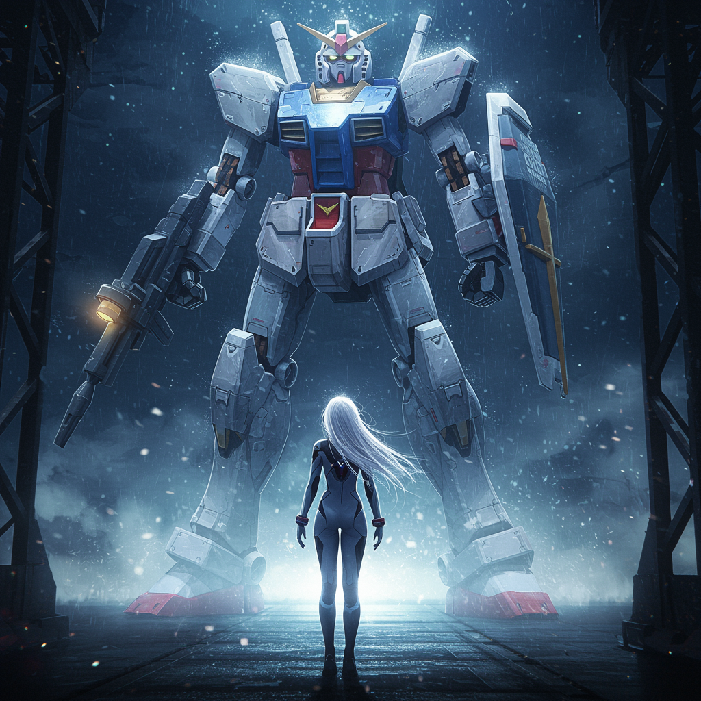 View this AI-generated image featuring a girl in a sleek form fitting jumpsuit stands in awe before a colossal gundam her long white hair flowing in the wind it s a dark rainy night and she stands alone gazing up at the towering figure the scene is trending on artstation characterized by extreme det