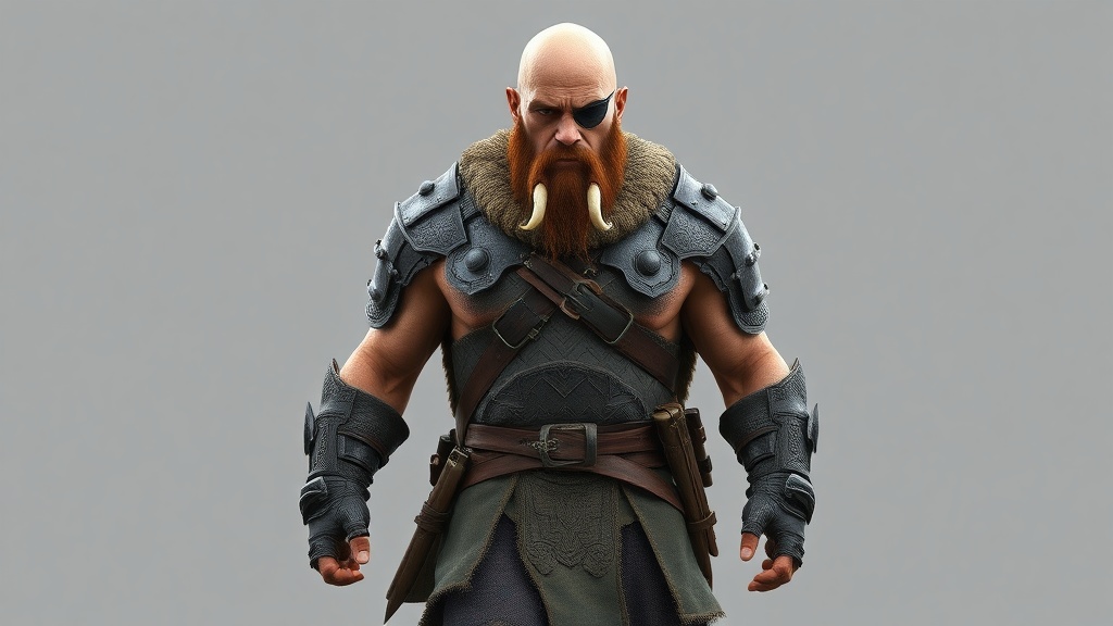 View this AI-generated image featuring full body walking pose slow motion bald half orc barbarian with an eye patch strong and muscular wearing intricately stitched layered armor detailed face and eyes masterpiece quality 8k resolution photorealistic inspired by artists jeremy mann sandra chevrier a