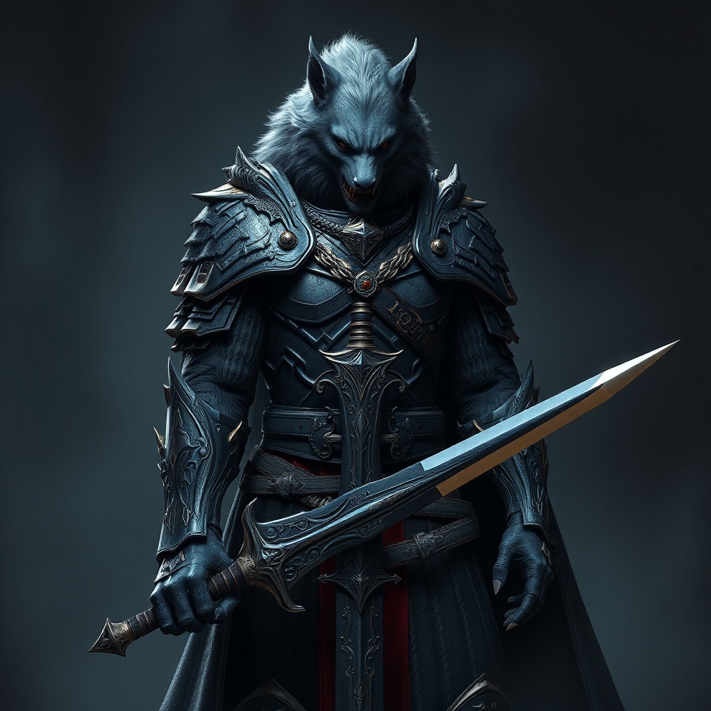 View this AI-generated image featuring full body portrait of blaidd the werewolf from elden ring depicted as a werewolf with a grand imposing sword he is adorned in dark intricately detailed armor that captures the essence of the elden ring universe set within a dark fantasy ambiance the scene is re