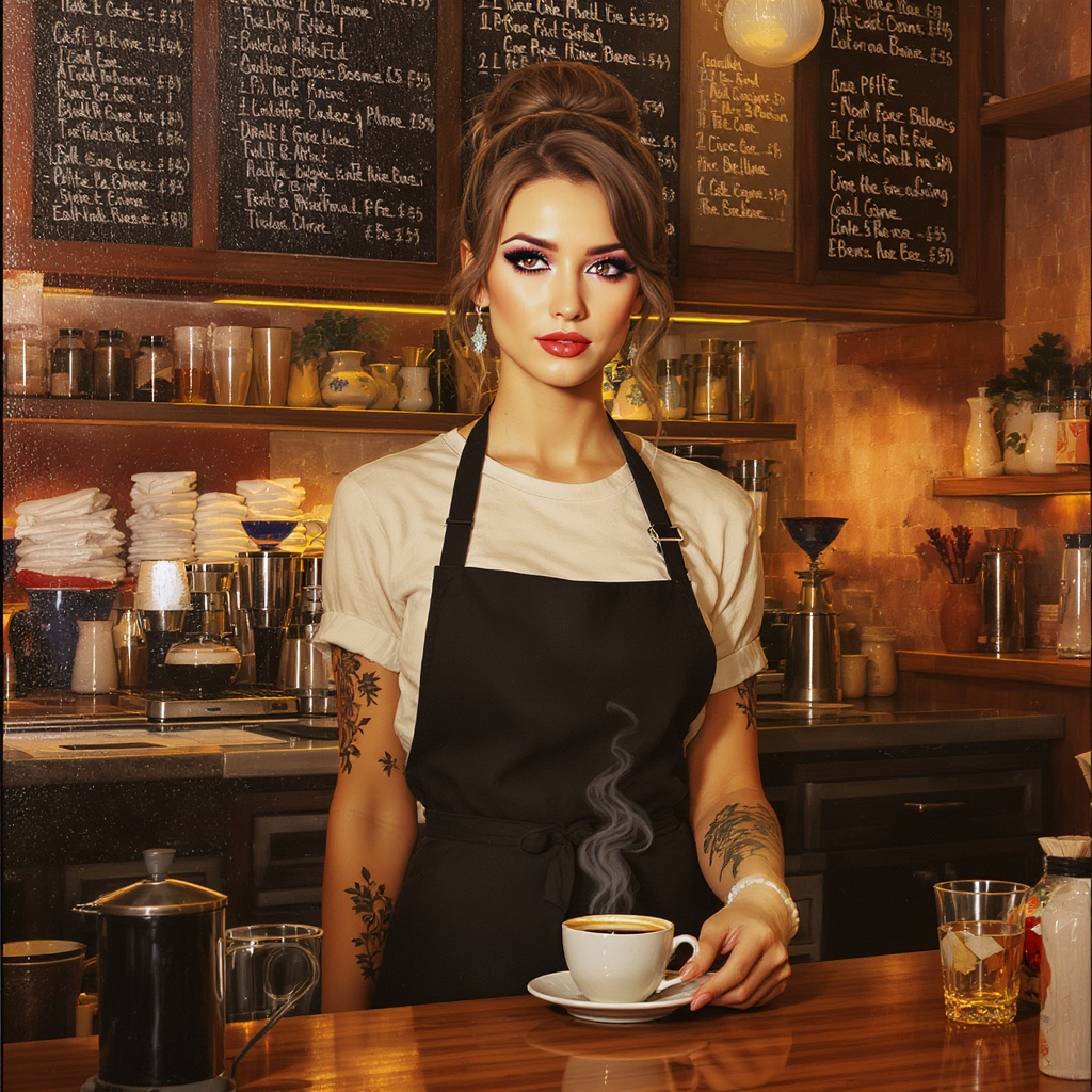 View this AI-generated image featuring full body portrait of the most beautiful barista girl in the world eye focus serving coffee detailed symmetrical face reflective eyes mascara makeup prominent cheekbones cozy tattoos detailed lighting dramatic chiaroscuro modern cafe interior design stomach mus