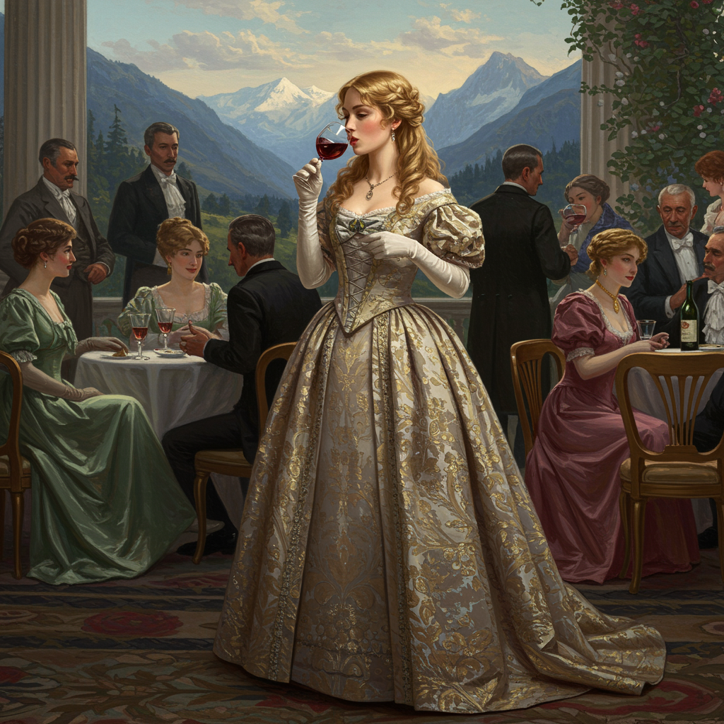A stunning full-body portrait of a high-class society woman exudes elegance as she stands amidst a luxurious gathering, enveloped in an exquisite French-style gown that cascades gracefully, its fabric shimmering with intricate patterns. Her long, wavy tresses frame a face of timeless beauty, as she delicately sips from a crystal glass of rich, red wine. The scene is bustling with elegantly dressed figures engaged in lively conversation, their presence subtly blurred to emphasize the woman's captivating charm. Painted in hyper-realistic, high-resolution detail reminiscent of Frank Frazetta's mastery, the foreground fades into a breathtaking mountainous landscape, reflecting the grandeur of Albert Bierstadt's brushwork, which forms a majestic backdrop to the sophisticated serenity of the tableau.