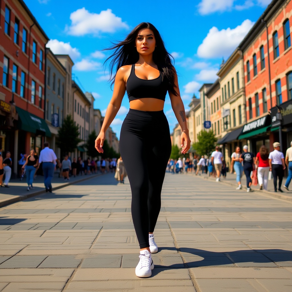 View this AI-generated image featuring a stunning full body portrait of a beautiful fitness enthusiast strolling through a bustling downtown area she has long flowing hair and a well proportioned symmetrical face with captivating reflective eyes the scene features intricately detailed lighting inclu