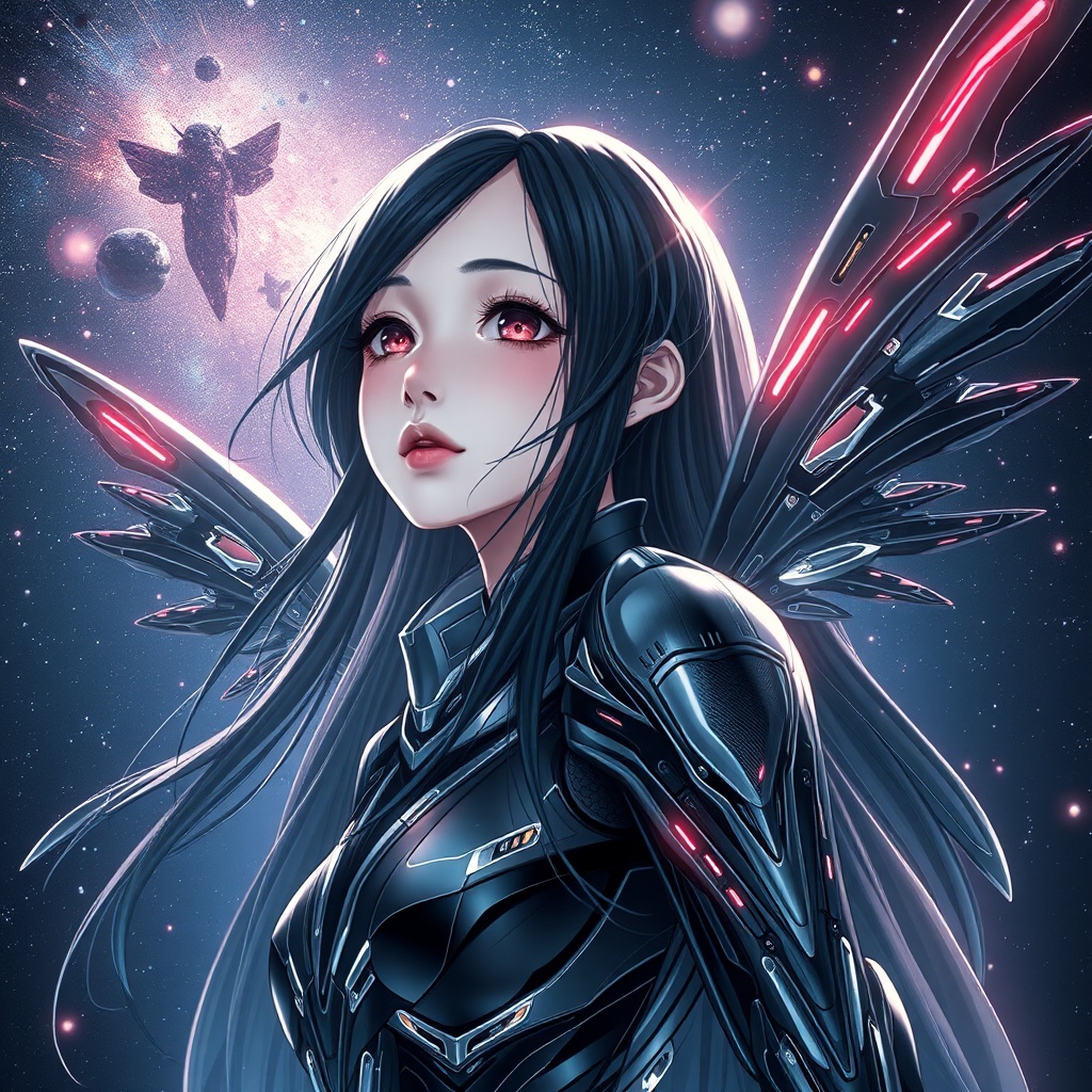 Full portrait close-up, epic depiction of a stunning girl adorned in a sleek Sci-fi exo suit, radiating beauty with her captivating, dreamy expression, long flowing black hair, and elegant figure gazing into the cosmos, features ultra-detailed glossy black and silver insectoid Sci-fi mech elements, complete with intricate Sci-fi wings embodying an insect-like aesthetic, inspired by the styles of Tsutomu Nihei and Akira, set against a backdrop of brilliant quasar illumination and the vastness of outer space, enhanced with dramatic scenes, volumetric graphics, showcasing influences of anime art and manga illustration, space starlight and galaxies in the distance, intersected by glowing plasma trails, rendered in stunning 8K UHD resolution with hyper-realistic intricacies and complex lighting effects.