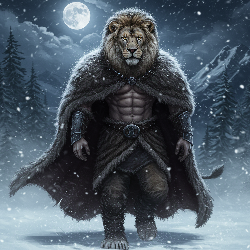A majestic fusion of man and lion strides with regal grace through the swirling blizzard of a winter's night, its fur cloak billowing like a storm-tossed sea. This mythical creature, a portrait of raw power and nobility, exudes an aura of fantasy and mystery. The moonlight catches the glint in his leonine eyes, illuminating the snowflakes that cling to his thick mane. His sinewy form is draped in luxurious furs that echo the wilderness and strength of an untamed realm, reminiscent of a scene conjured by the vivid imagination of Greg Rutkowski.
