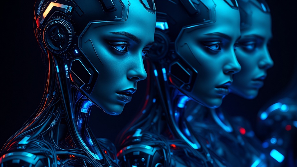 Futuristic cybernetic women, intricately detailed anatomical design, deep midnight and vibrant azure hues, high contrast and dynamic lighting, smooth and flowing forms, captured with a National Geographic photographic essence, revealing translucent layers and intricate circuitry.