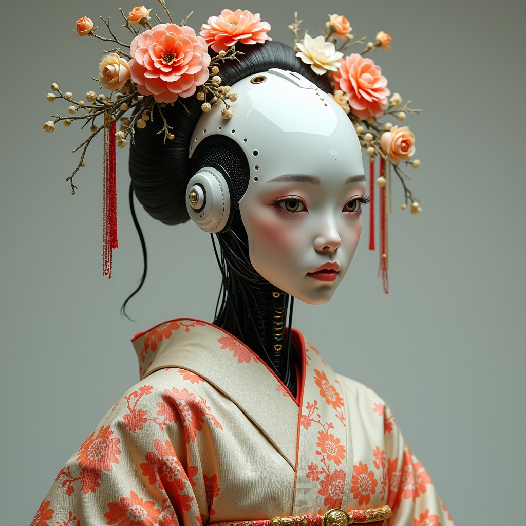 View this AI-generated image featuring futuristic geisha android adorned with intricate robotic elements wearing an elegant kimono adorned with floral patterns. Created using advanced AI technology, this image showcases creative visuals, AI artwork. Perfect for creative projects, digital art, inspir