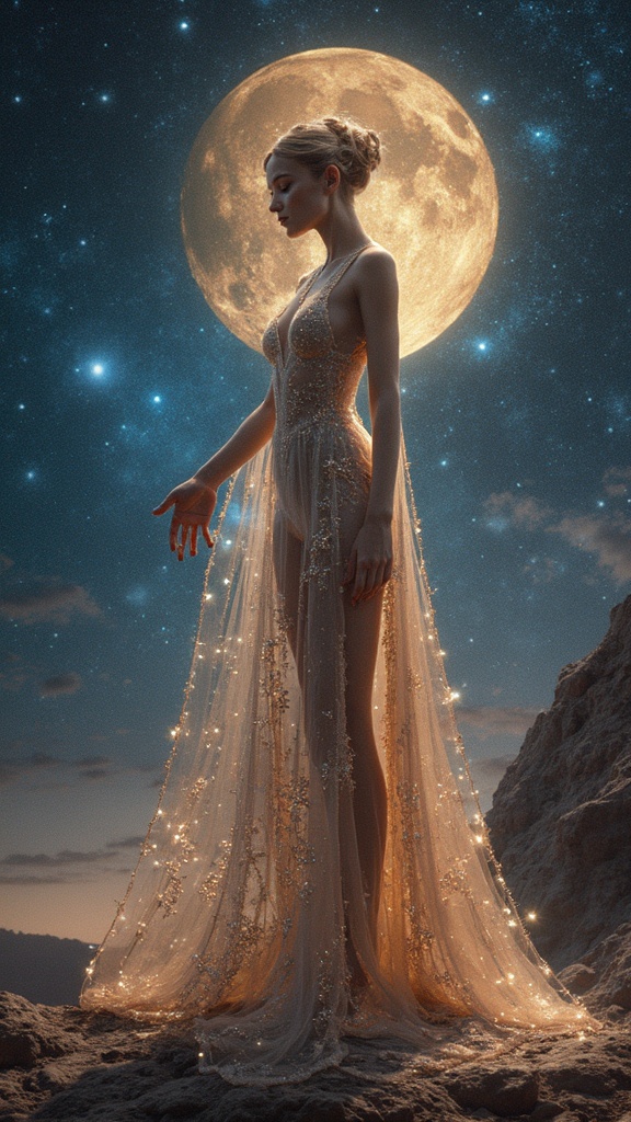 View this AI-generated image featuring galaxy enchantress celestial entity graceful ethereal full body form captivating alluring feminine allure affection charming fervor splendor poised majestic stance stylish daft punk inspired artistic style reminiscent of roger fry gaston le touche. Created usin