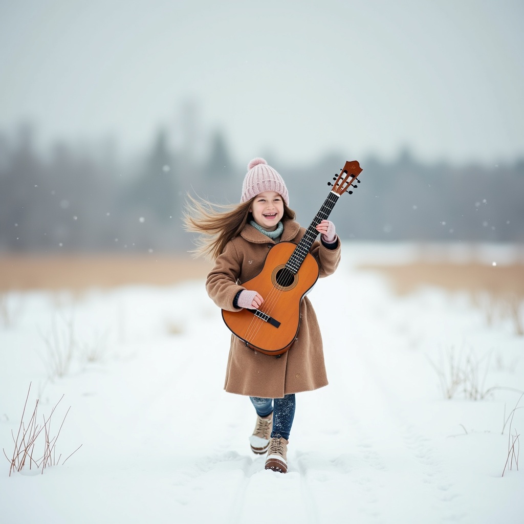 View this AI-generated image featuring a young girl dashes across the snow draped field her laughter mingling with the crisp winter air as she revels in the dance of falling snowflakes her voice rings out a joyful melody that echoes the freedom of the open landscape cradling her cherished bandura sh