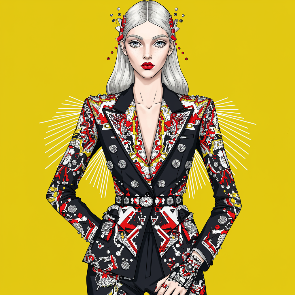 View this AI-generated image featuring a stunning girl with delicate features and pale white skin dressed in a sleek fashion suit adorned with vibrant intricate embellishments and geometric patterns in a minimalist style the illustration features a chelsea yellow background with color matching focus