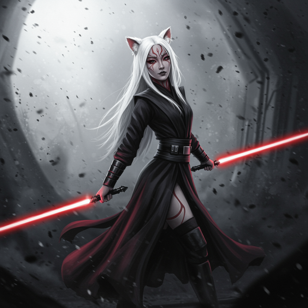 An Asian girl with white hair and cat ears, embodying the presence of a Sith lord in a hyperdetailed, monochrome masterpiece. She strikes a dynamic pose with an immersive, grayscale background that emphasizes depth of field. The scene is depicted in an 8k resolution, enhancing the intricate details and the aura of power surrounding her.